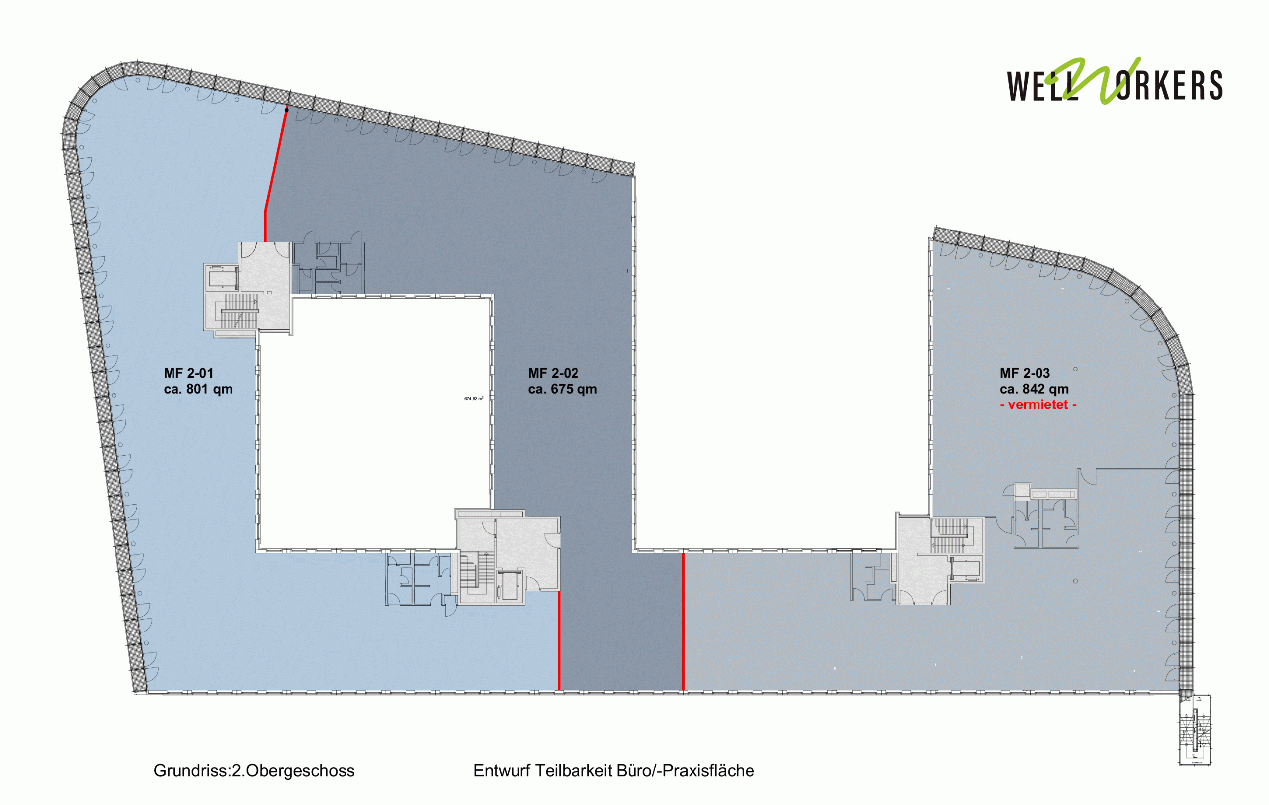Mit den drei separaten Eingangsbereichen und Erschließungskernen ist schon für höchste Flexibilität gesorgt. Separate Büroeinheiten lassen sich schon ab einer Größe von ca. 270 m² umsetzen. Die technischen Eckdaten schaffen volle Bewegungsfreiheit bei der Raumgröße. Von effizienten Einzelbüro mit rund 18 m² bis zur Open-Space-Lösung mit einer Auslauffläche von bis zu ca. 400 m².